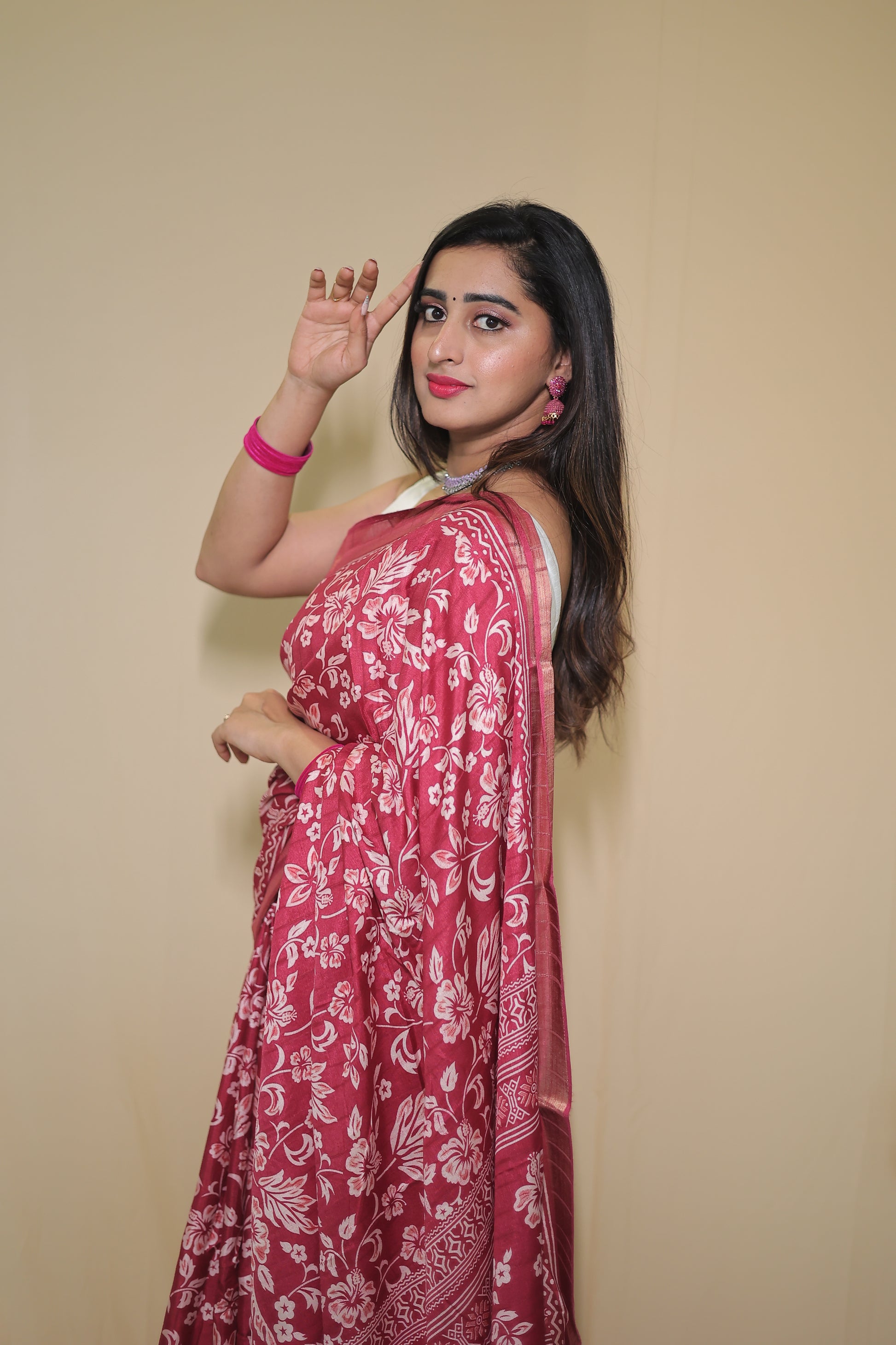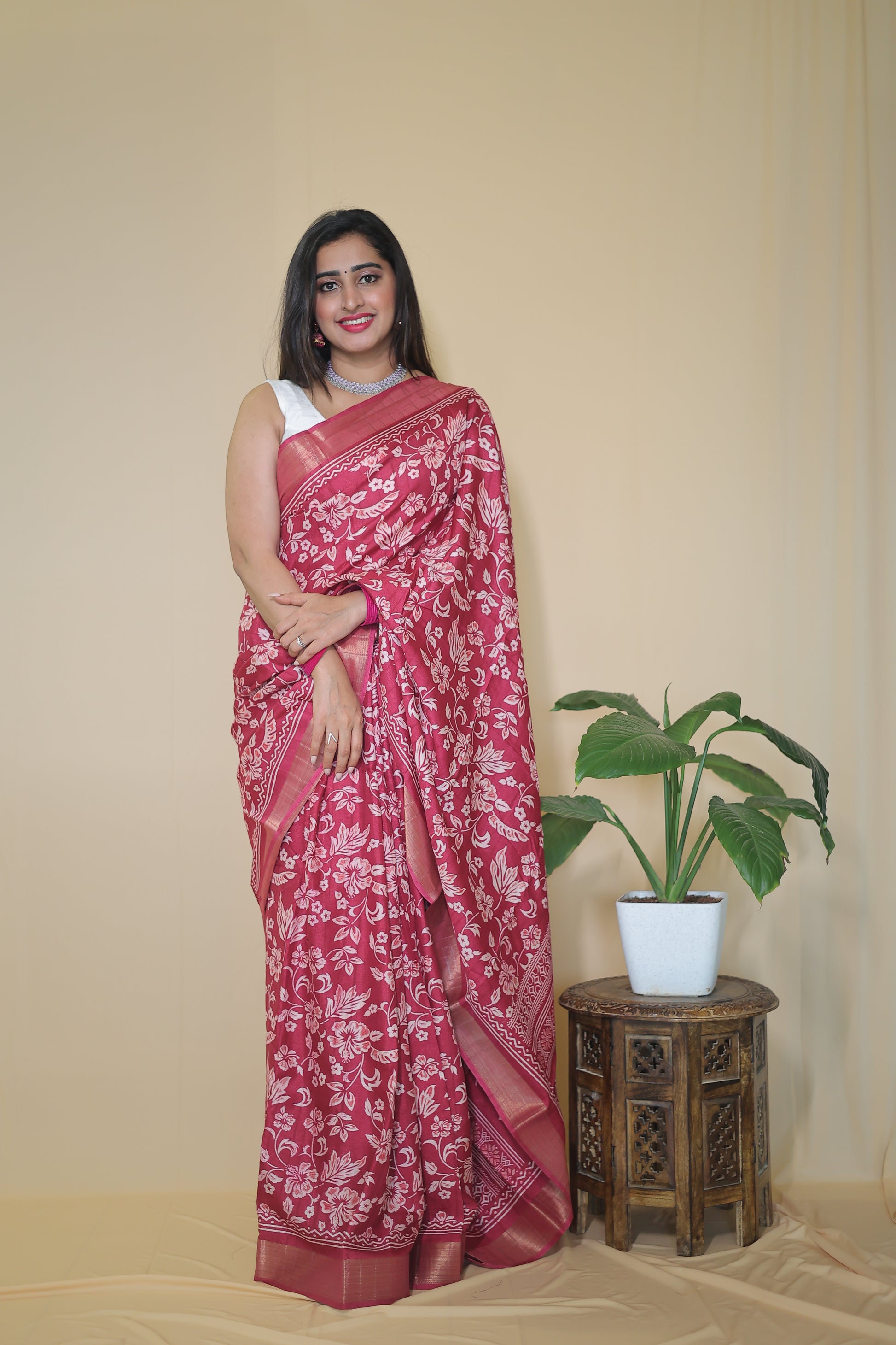 Rani Pink Banarasi Silk Saree with White Floral Motifs and Traditional Border