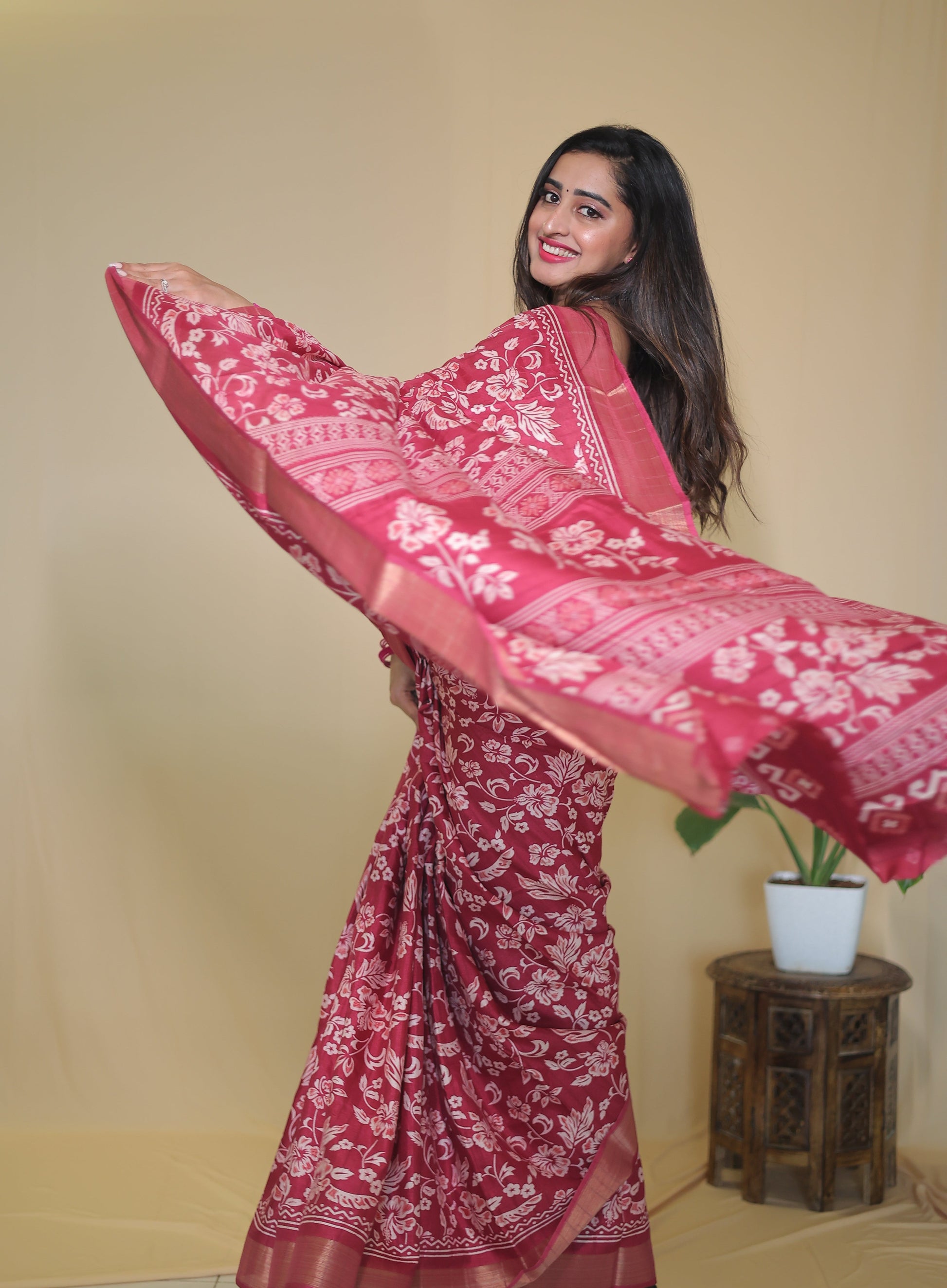 Enhance your ethnic collection with this exquisite Rani Pink Banarasi silk saree. Featuring intricate white floral motifs woven across the saree and a beautifully detailed traditional border, this saree is a masterpiece of elegance and craftsmanship. The luxurious silk fabric provides a regal look, making it perfect for weddings, festive occasions, and cultural celebrations. Complemented with a matching blouse piece, this saree effortlessly blends tradition and style.