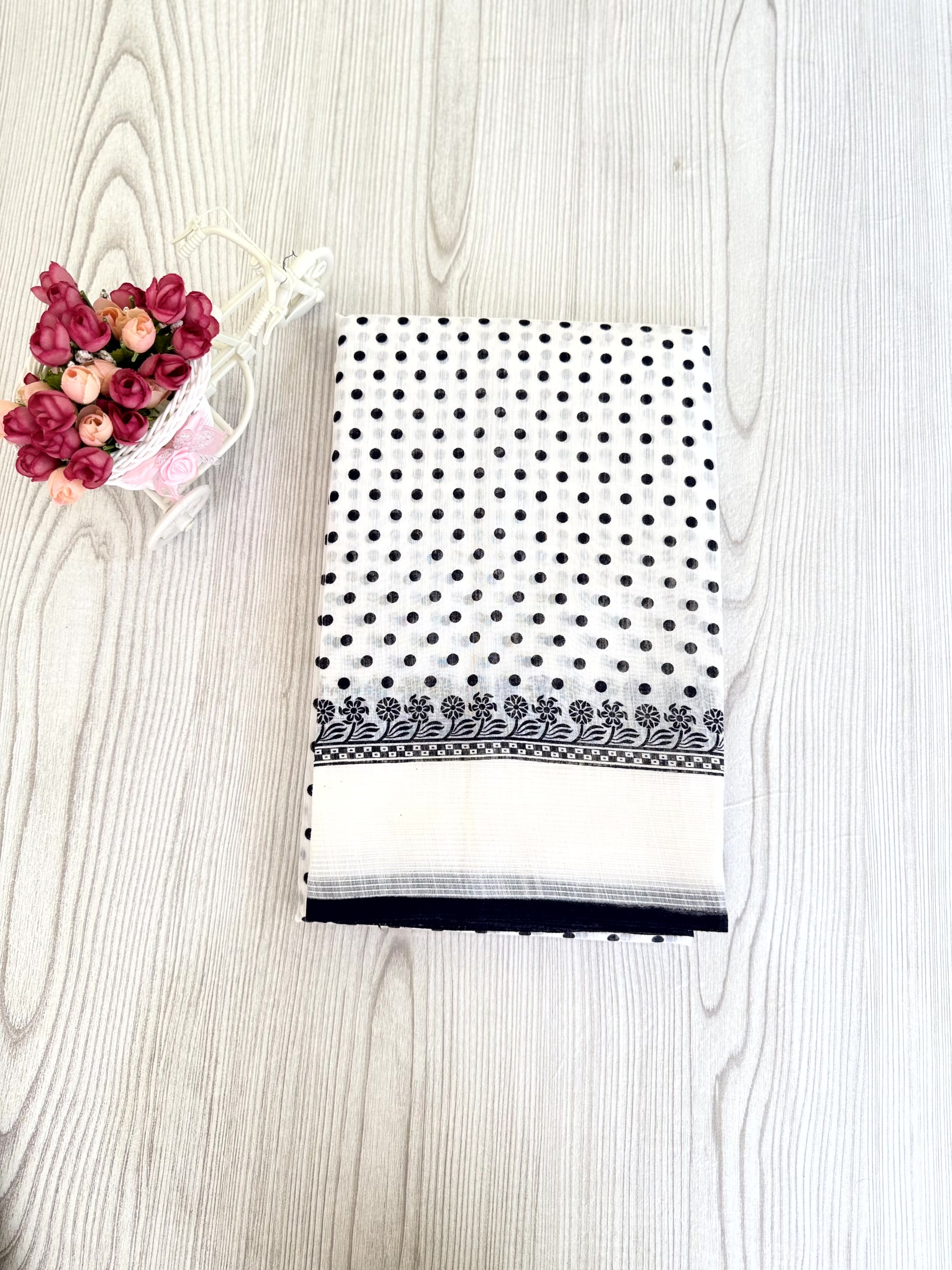Classic Black and White Cotton Saree with Polka Dots and Floral Patterns