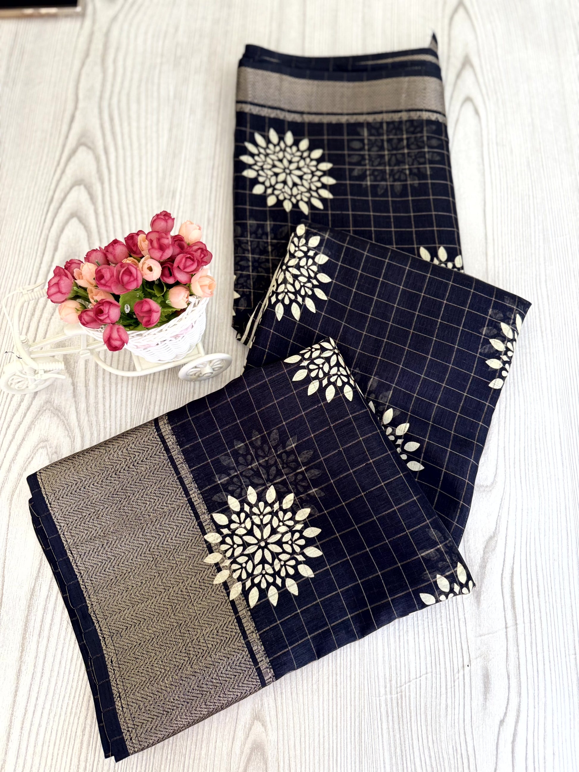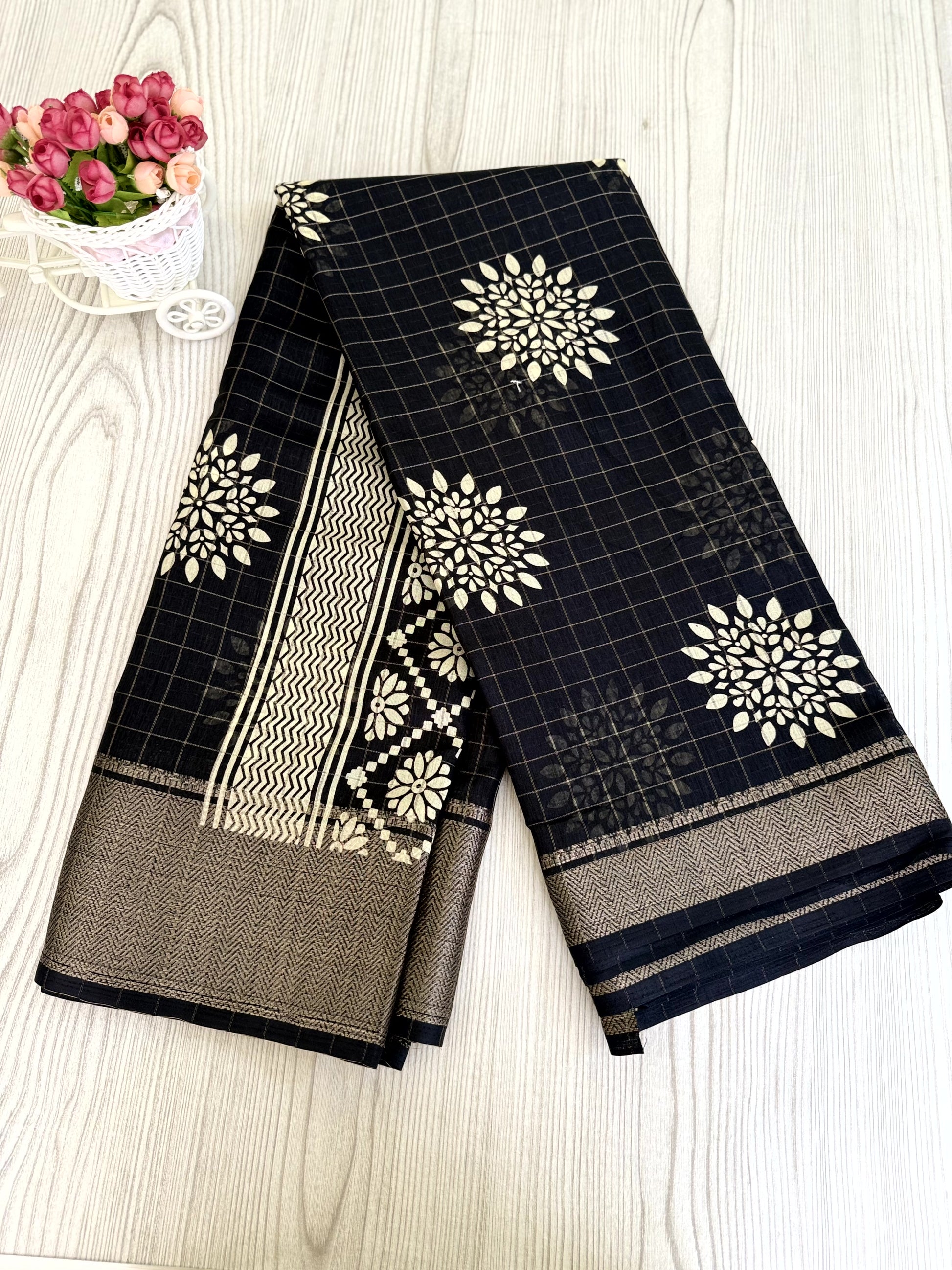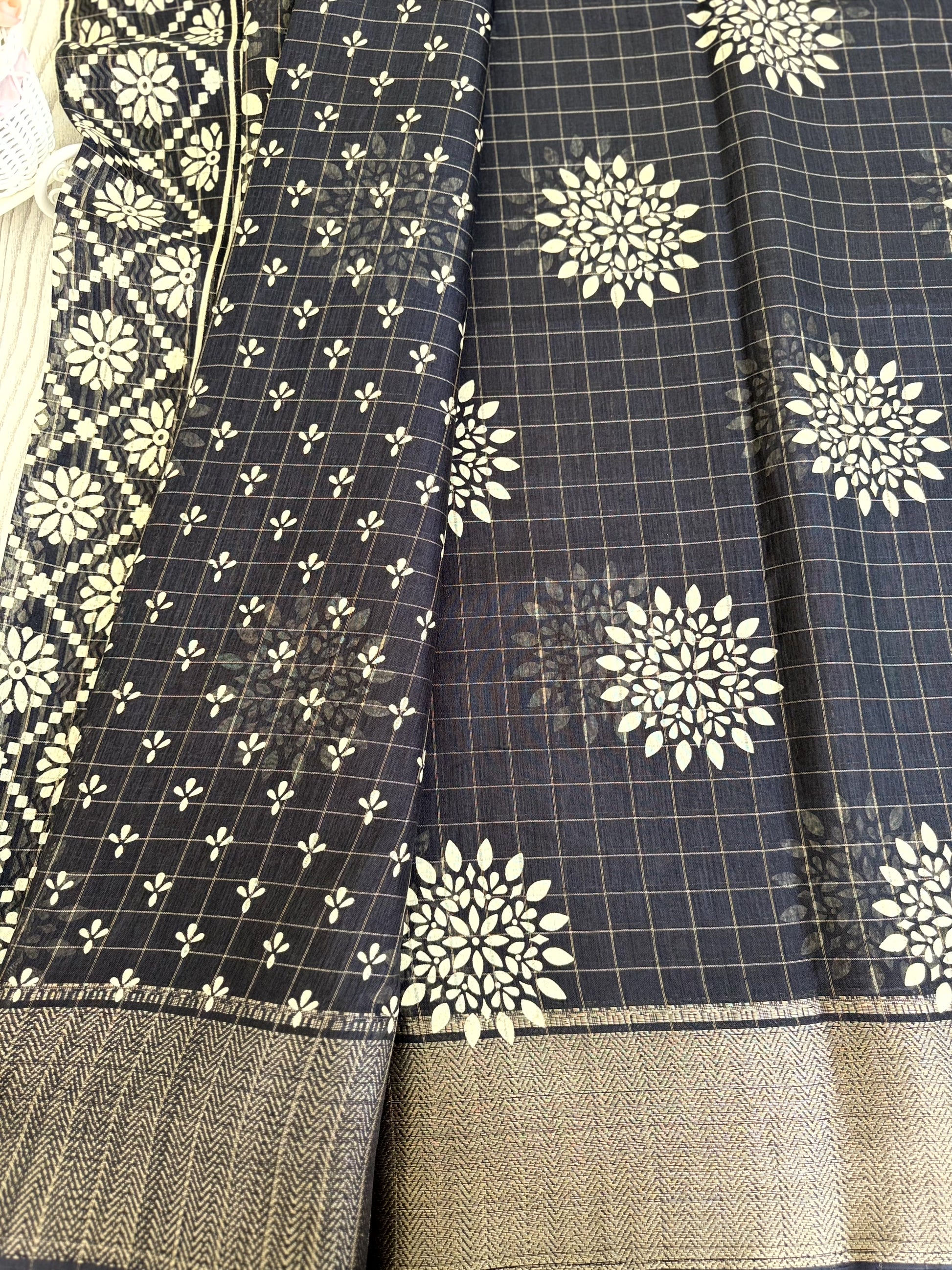Elevate your ethnic wardrobe with this Black Pure Binni Silk Saree, adorned with striking geometric checkered patterns and radiant floral motifs. The intricately designed golden border adds a touch of sophistication and elegance to the saree, making it perfect for both casual and festive occasions.