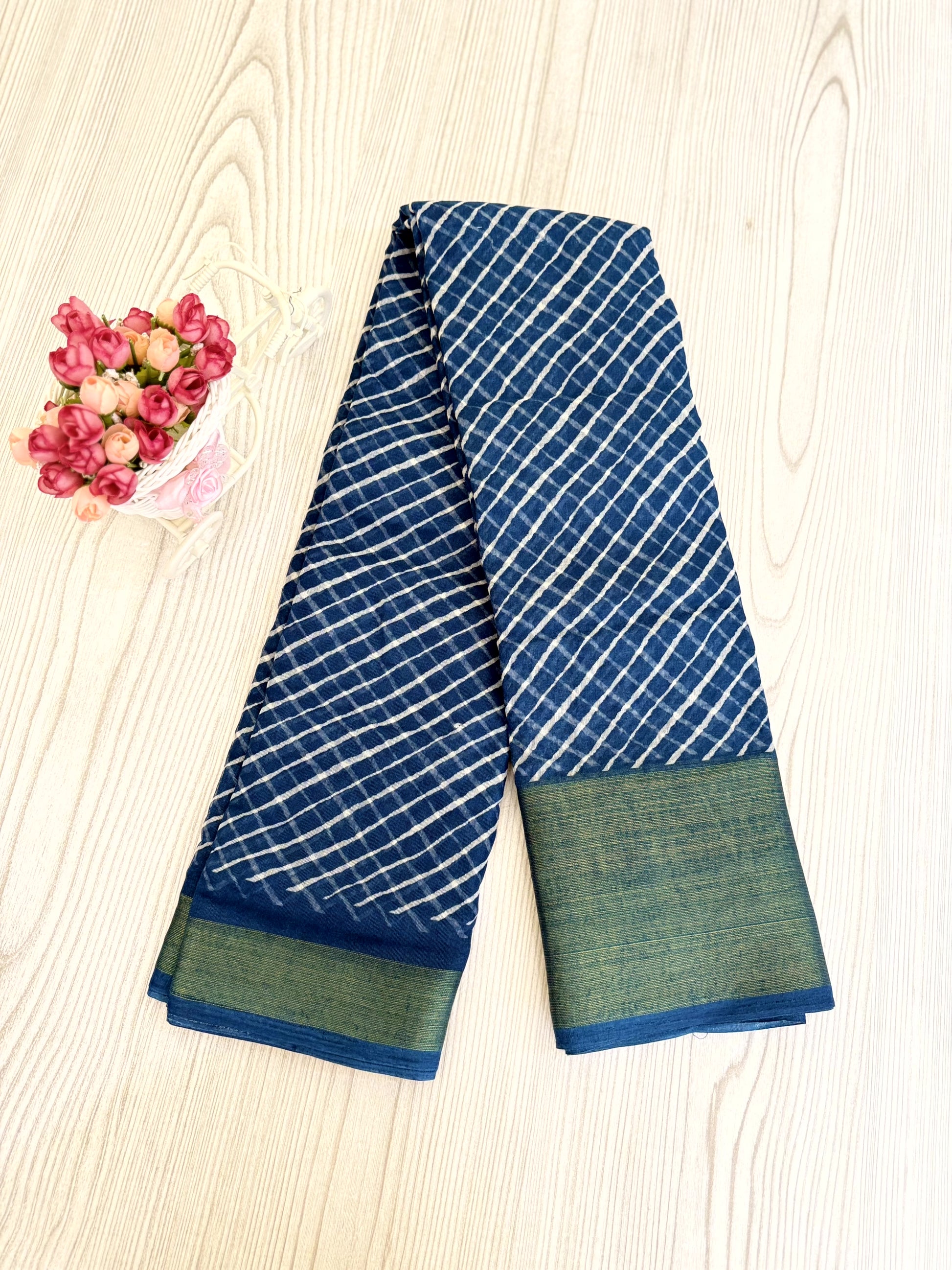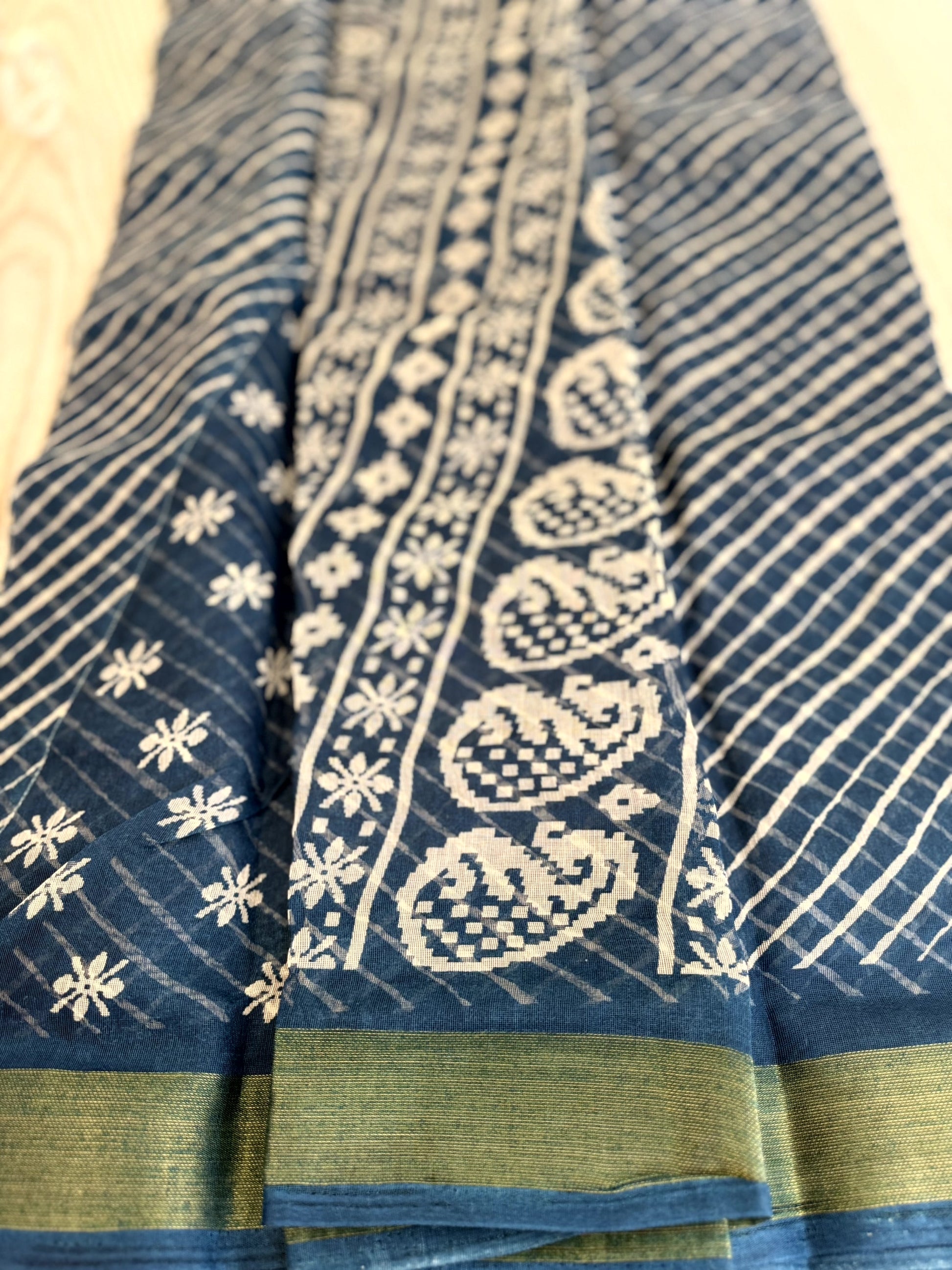 Step into sophistication with this beautiful sky blue cotton saree. Adorned with intricate white paisley and floral motifs, along with classic stripes, this saree is a perfect blend of tradition and elegance. The subtle green border adds a refined contrast, enhancing its appeal. Made from 100% pure cotton, this lightweight saree is comfortable for long wear, making it an ideal choice for casual, office, or festive occasions. Pair it with silver or oxidized jewelry to complete your look.