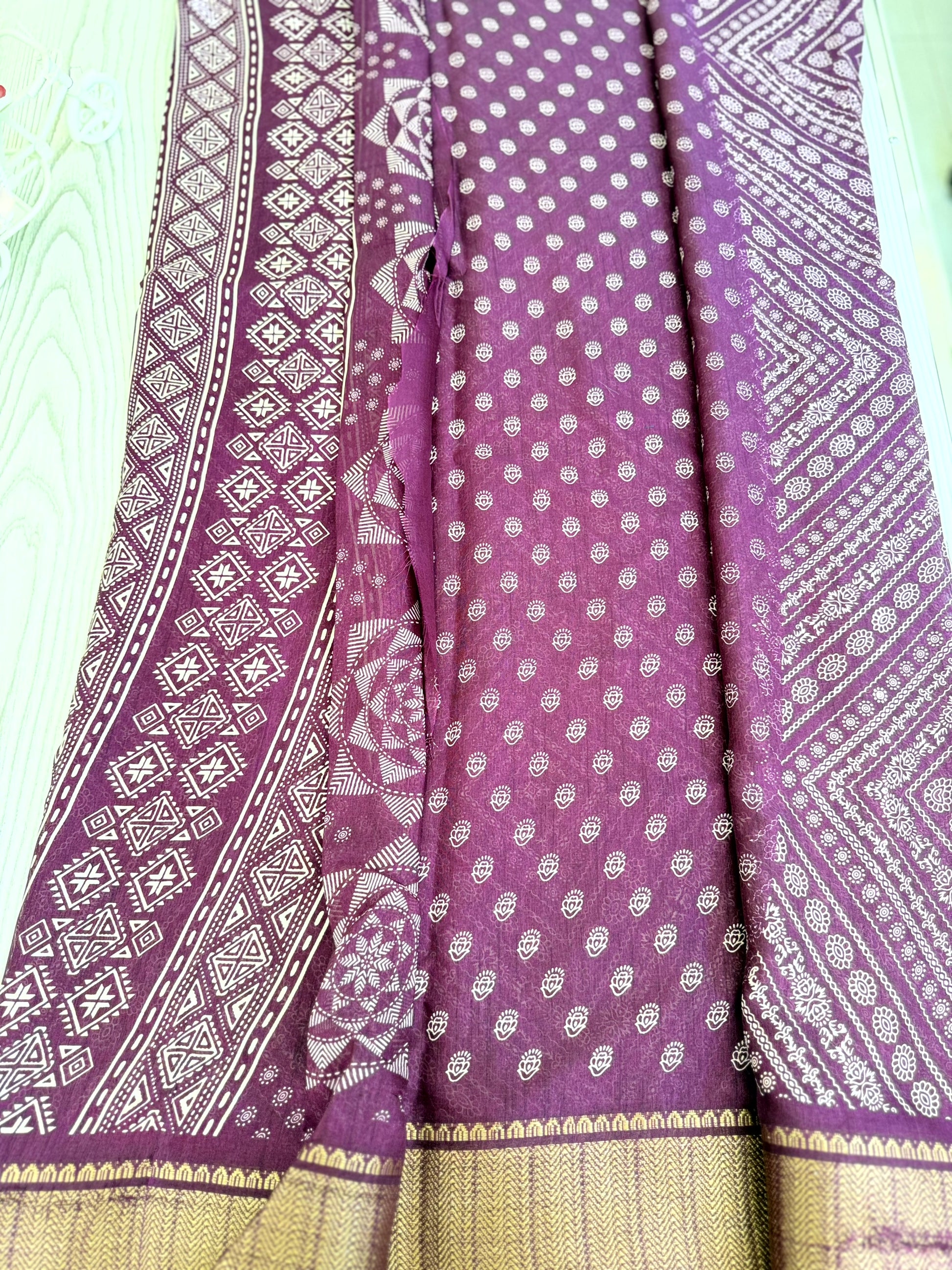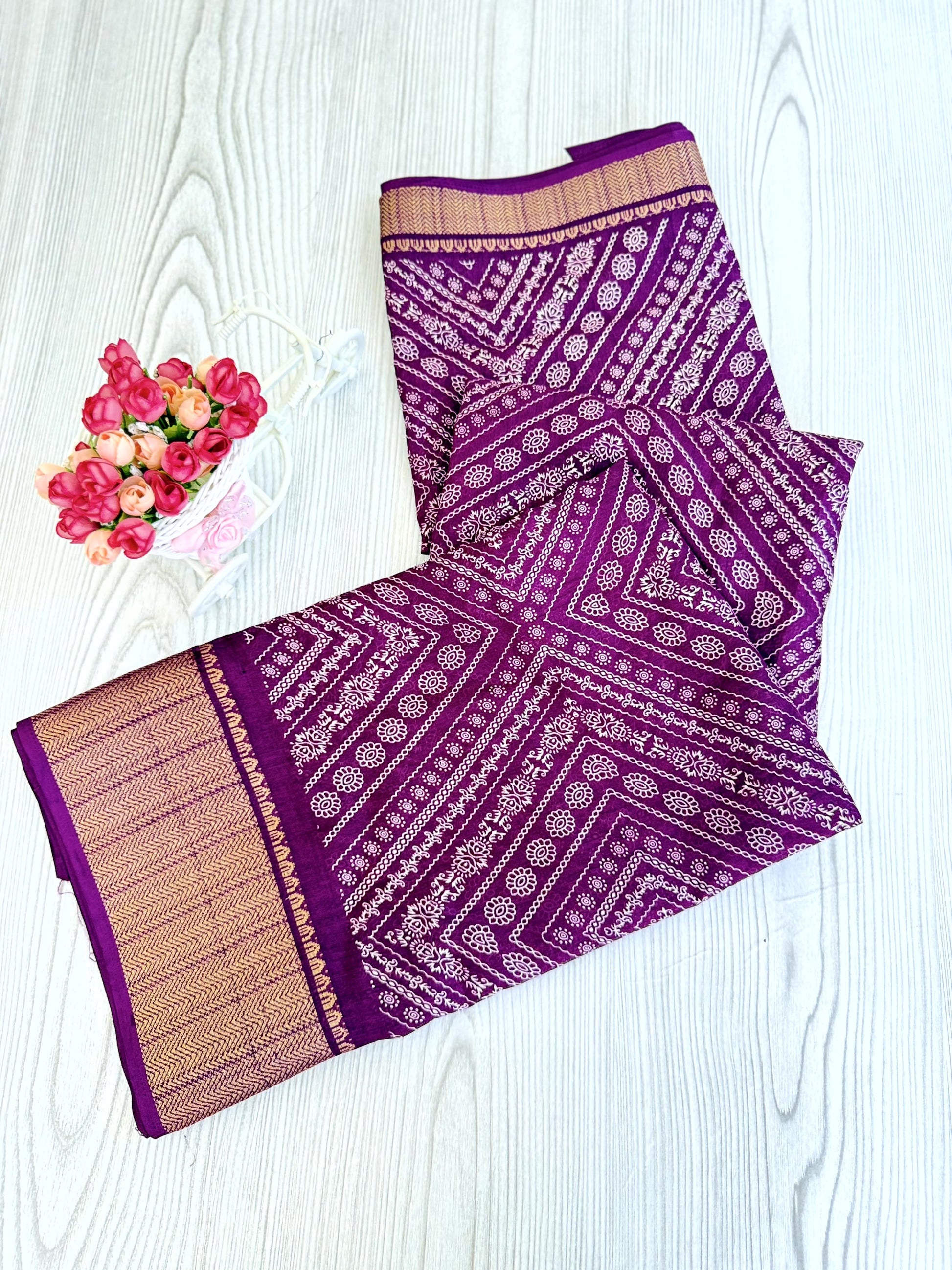 Graceful Purple Soft Silk Saree with Golden Border and Traditional Patterns