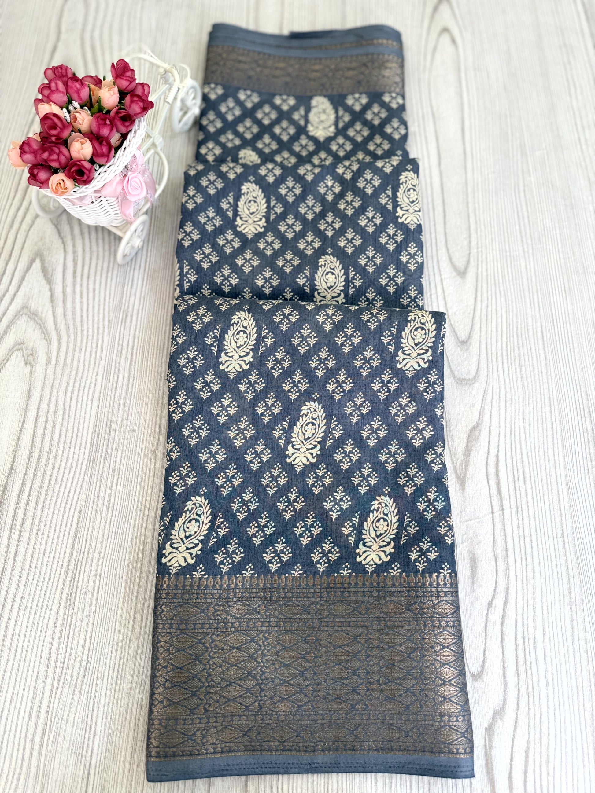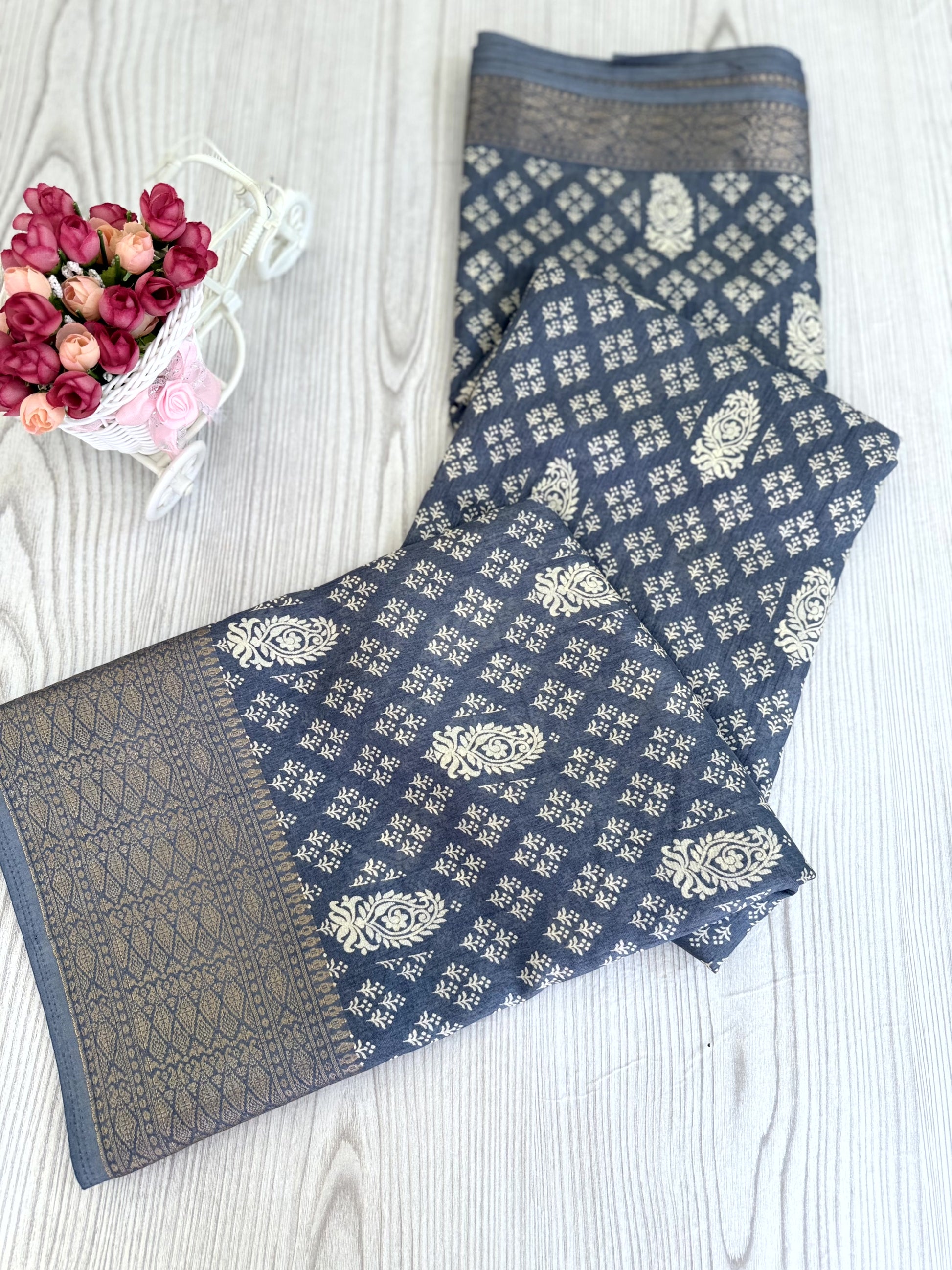 Add a touch of elegance to your ethnic wardrobe with this enchanting Grey Banarasi silk saree. Adorned with intricate silver zari work and traditional motifs, this saree exudes timeless charm and sophistication. The luxurious silk fabric paired with a classic silver border and pallu creates a perfect combination of grace and opulence. Ideal for weddings, festive occasions, and celebrations, this saree comes with a matching blouse piece for a complete look.
