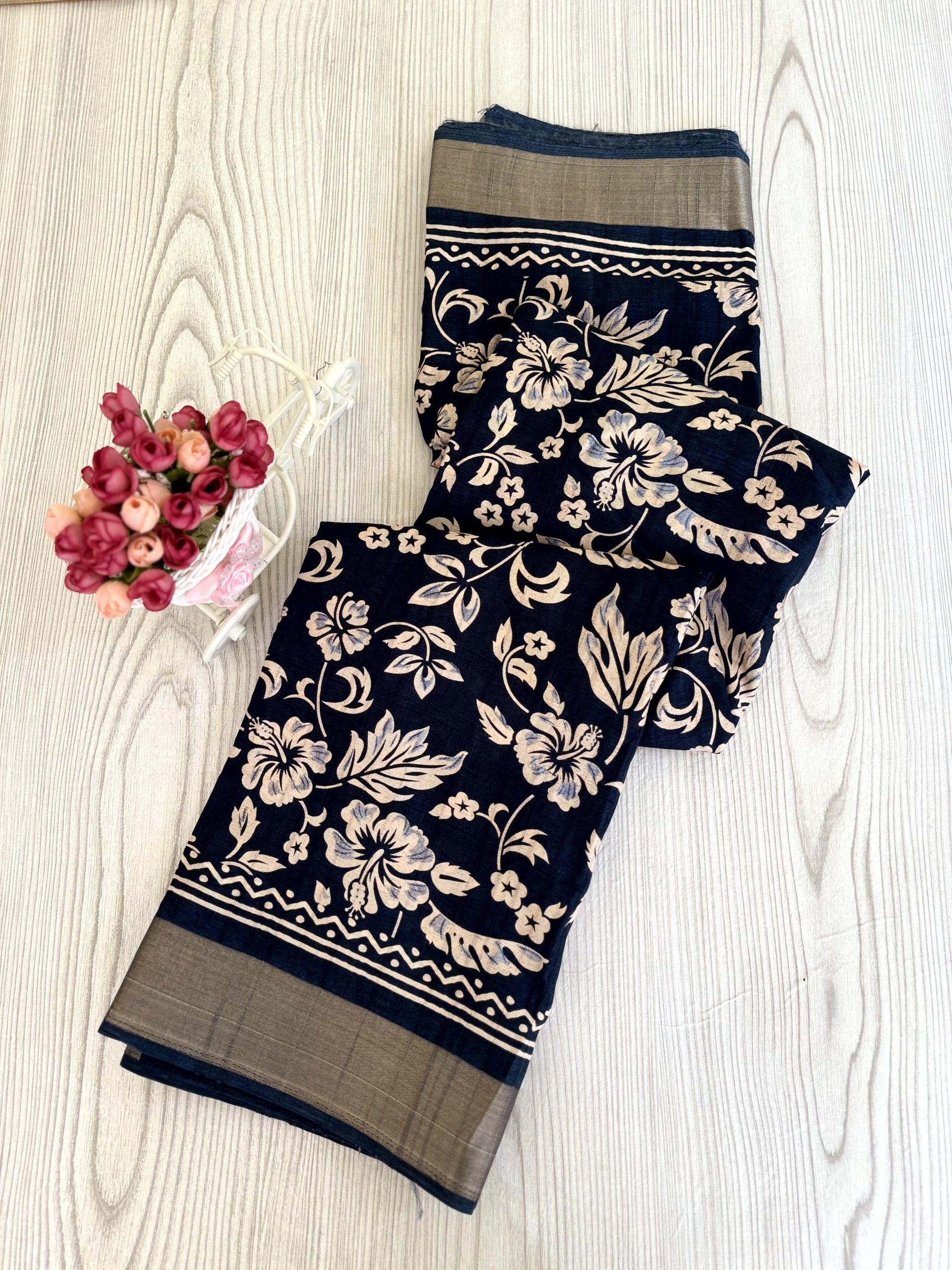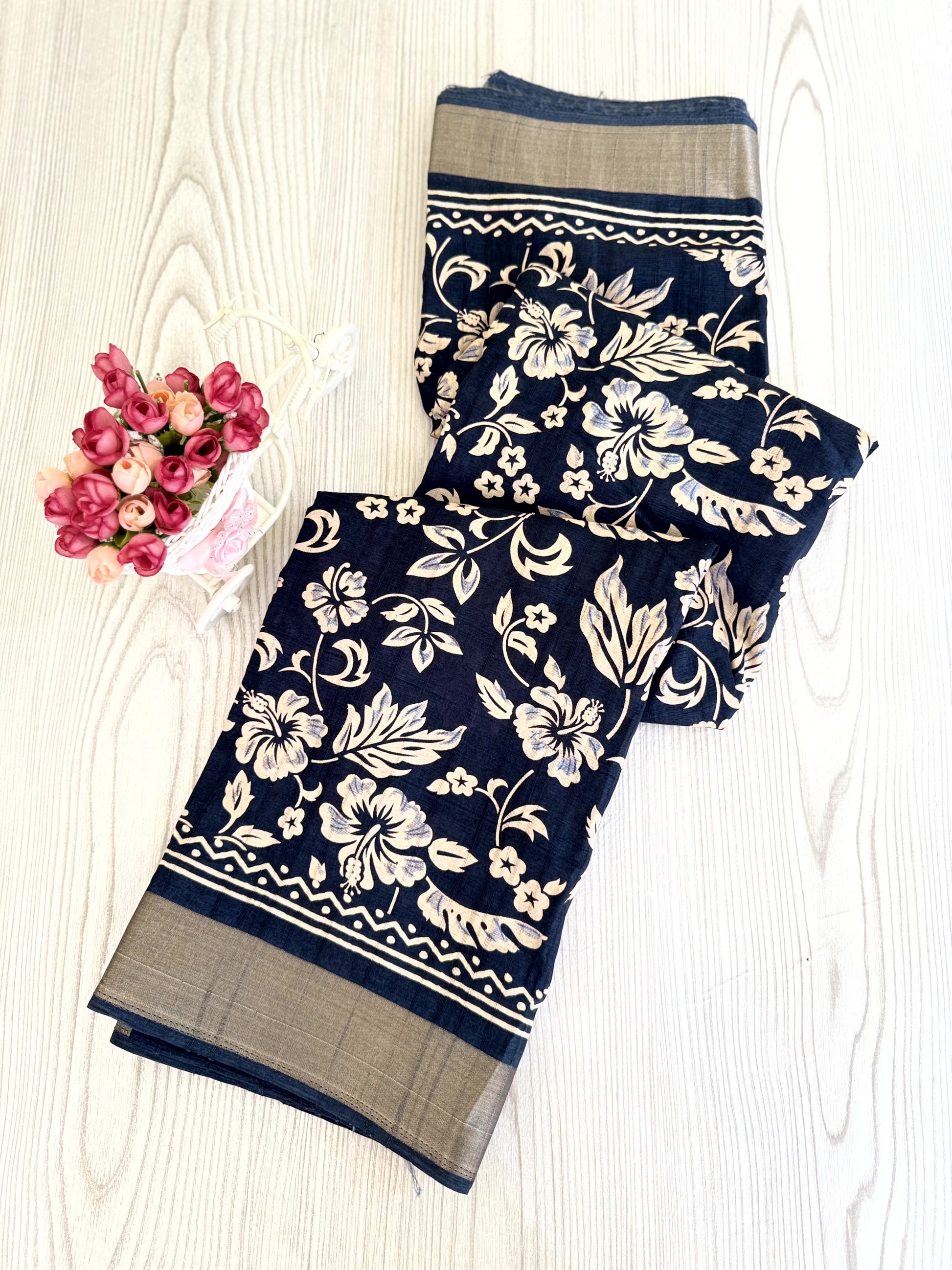 Indigo blue Banarasi Silk Saree with White Floral Motifs and Traditional Border