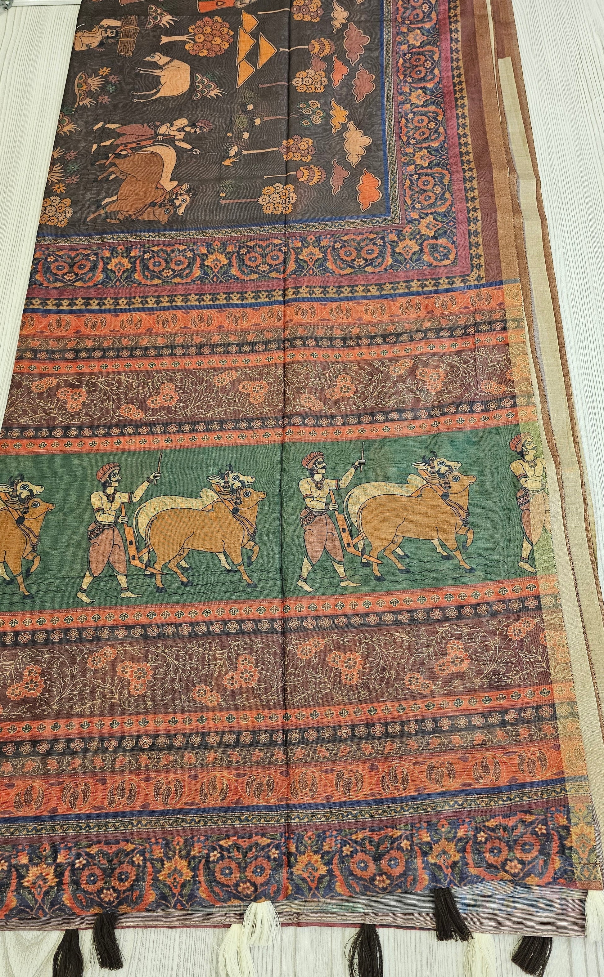 Step into a world of artistic elegance with this Kalamkari saree, featuring captivating digital prints inspired by traditional storytelling motifs. The saree boasts intricate patterns of floral designs, heritage-inspired borders, and detailed depictions of rural life, complete with vibrant colors and charming illustrations. The tassel detailing at the edges adds a unique touch of sophistication and charm.