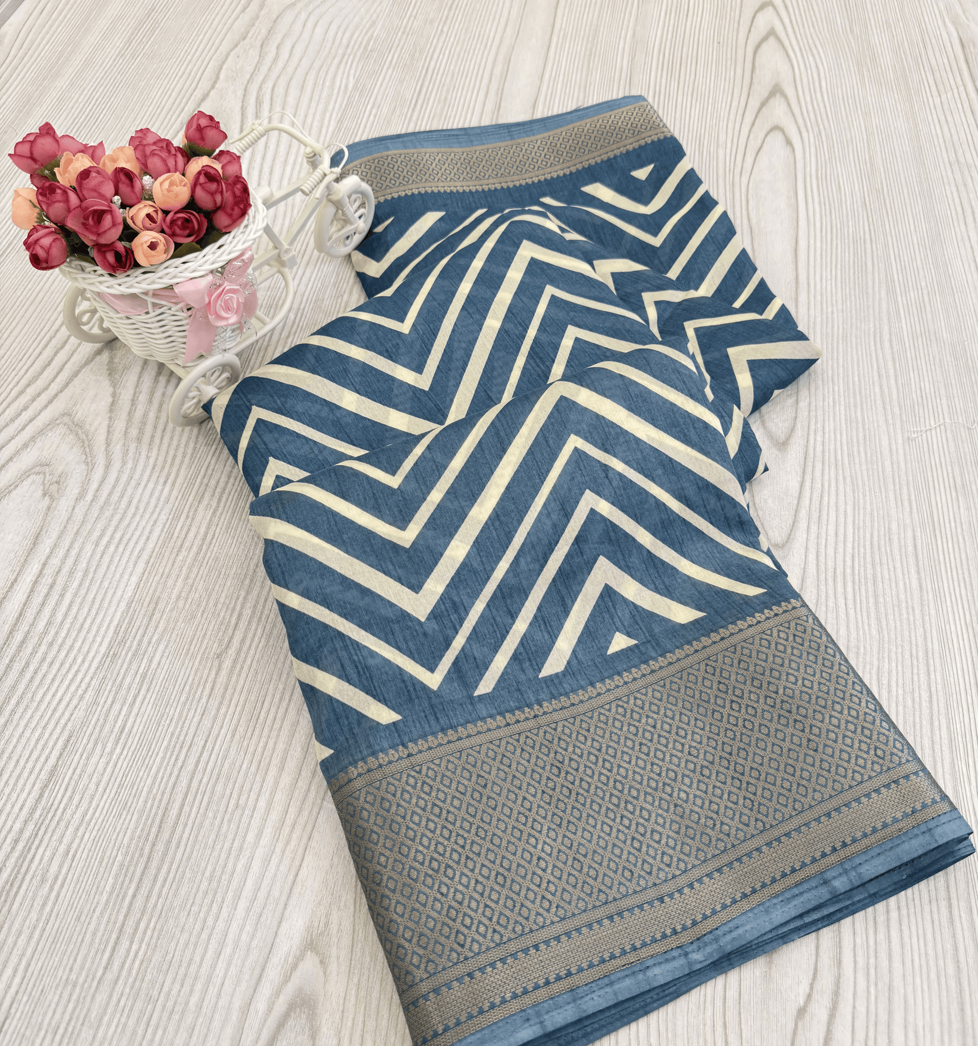 Light Blue Graceful Pure Soft Silk Handloom Saree with Contemporary Geometric Patterns and Matching Blouse