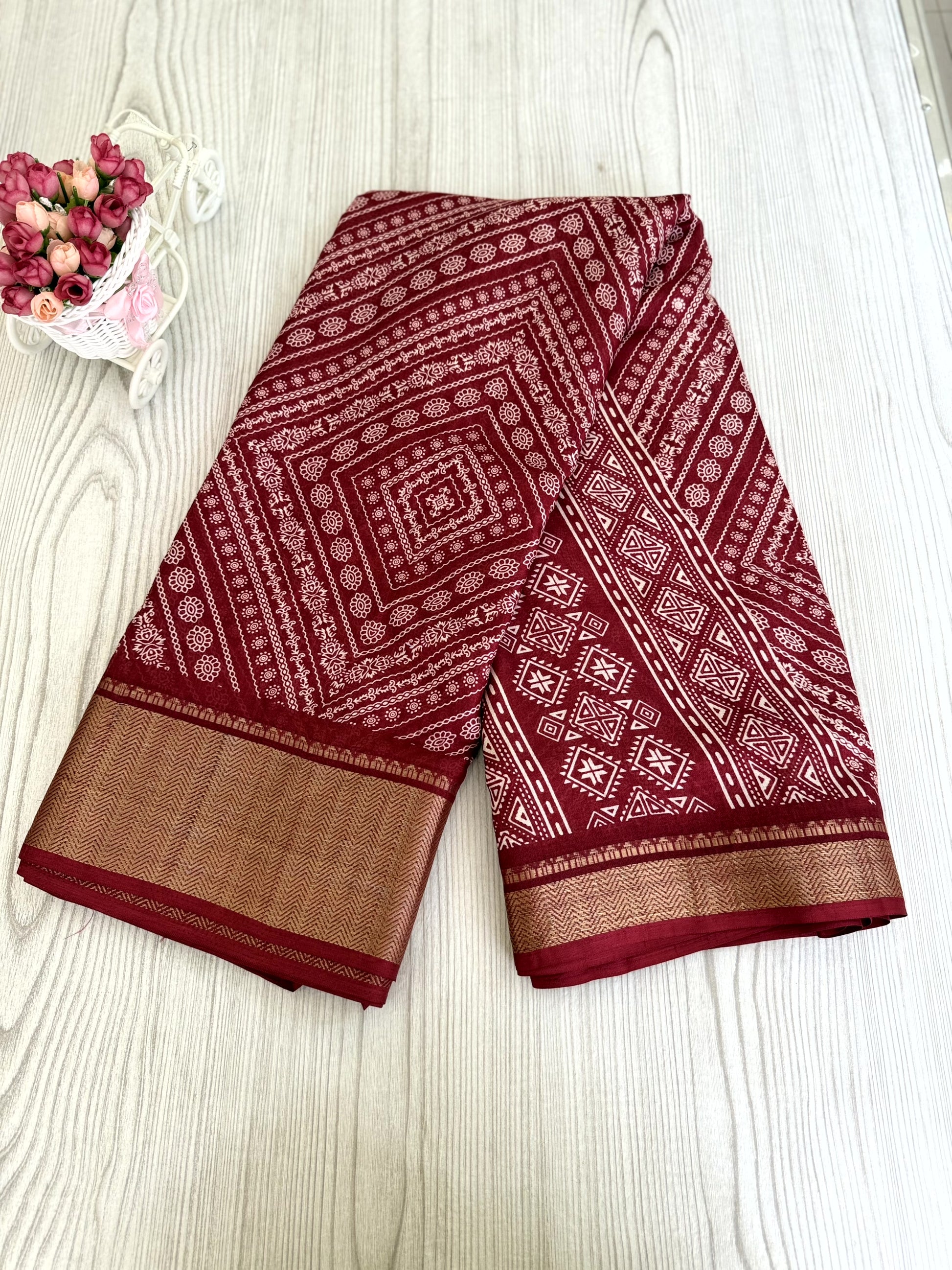 Add a touch of elegance to your wardrobe with this stunning soft Silk Saree. Featuring a traditional geometric and floral printed pattern, this saree is beautifully accented with a rich golden border, making it a perfect blend of tradition and style. Crafted from 100% pure soft silk , it ensures comfort and breathability, making it ideal for casual outings, festive occasions, or daily wear. Its vibrant color and intricate design make it a must-have addition to your saree collection.