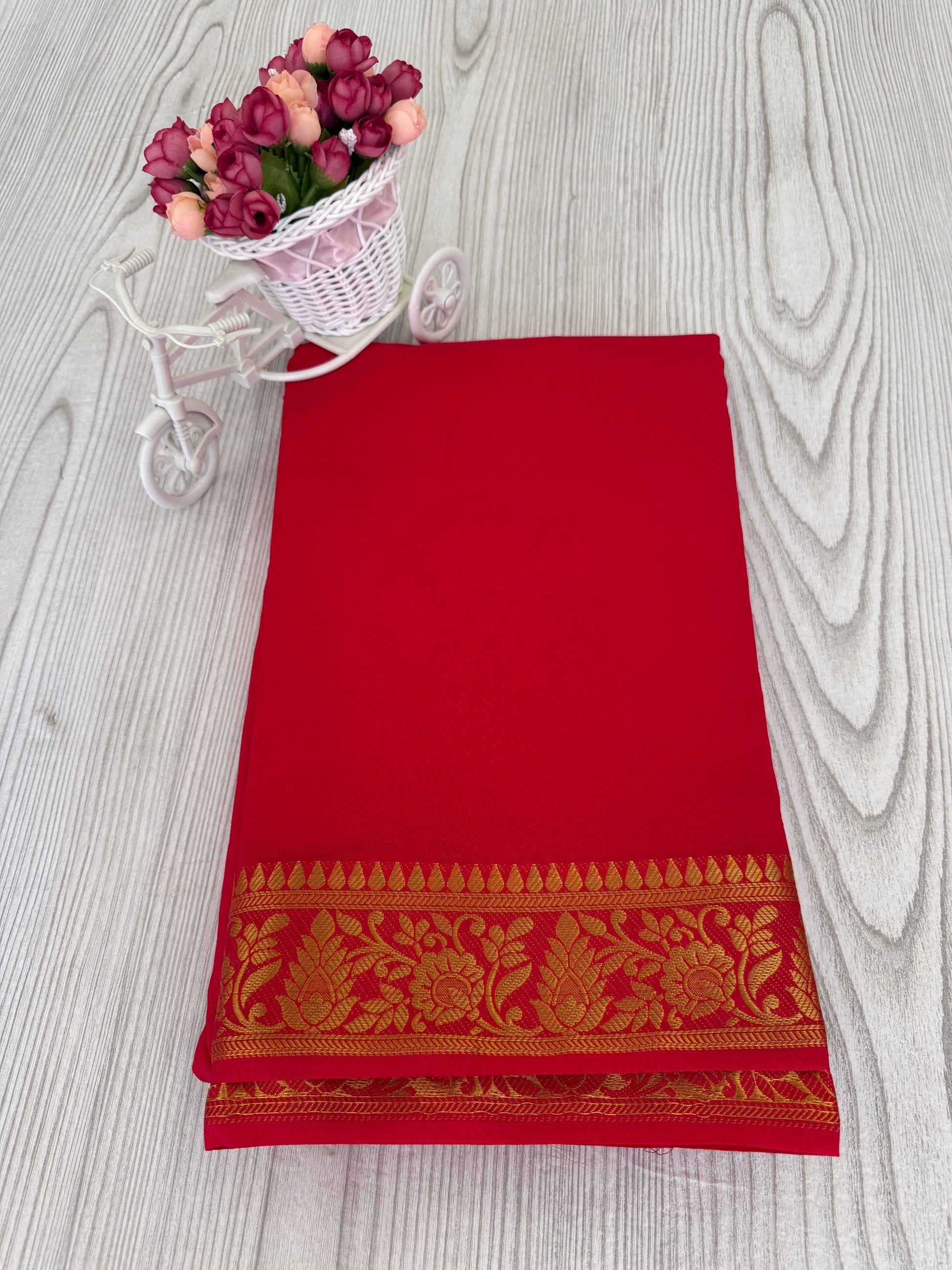 Drape yourself in timeless elegance with this exquisite Semi Mysore Silk Saree in a stunning red hue. Crafted with a smooth, lightweight texture, this saree offers the luxurious feel of Mysore silk with added durability. The rich golden zari border enhances its regal charm, making it an ideal choice for festive occasions, weddings, and celebrations.