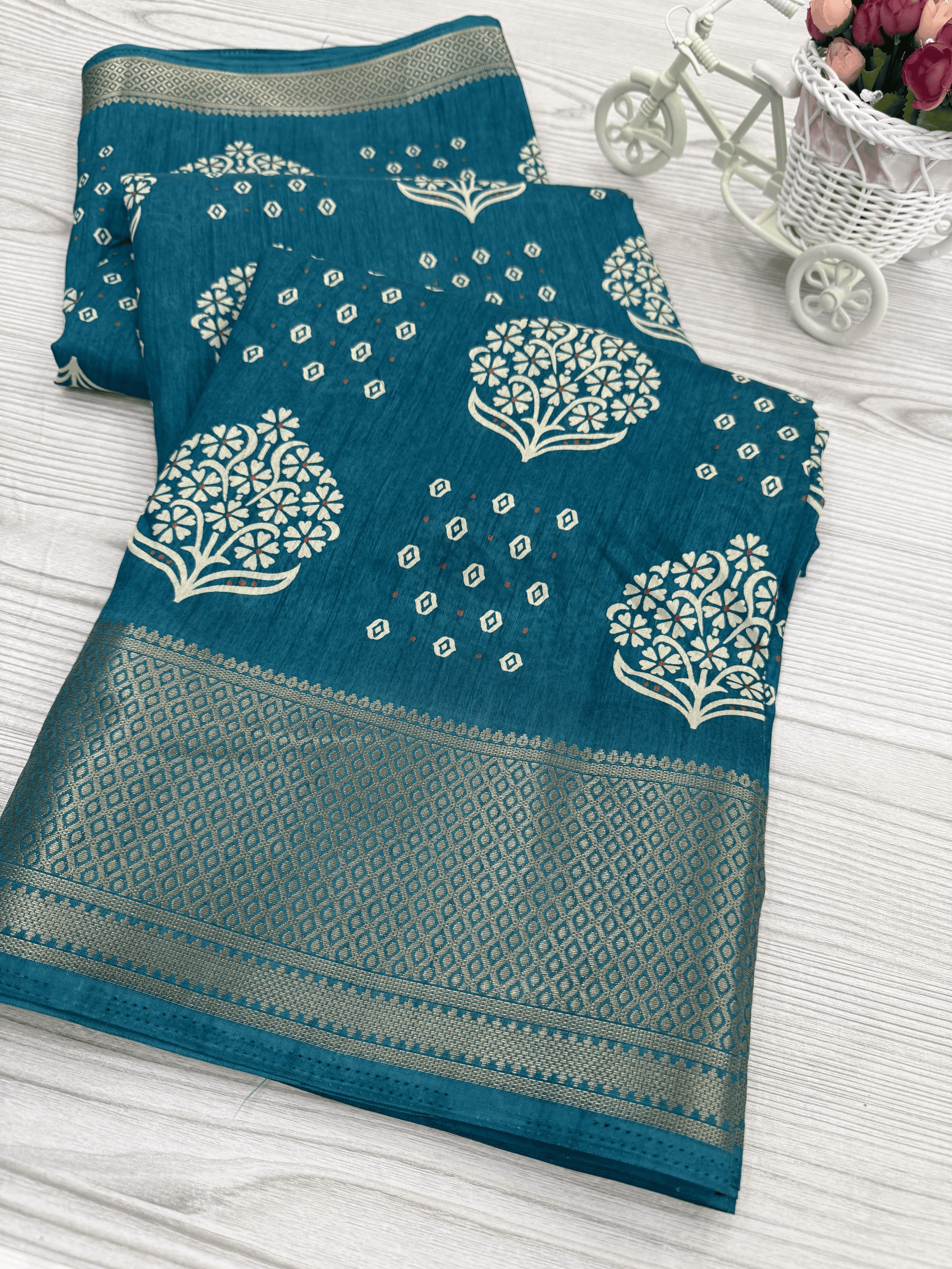Teal Banarasi Silk Saree with Intricate White Floral Motifs